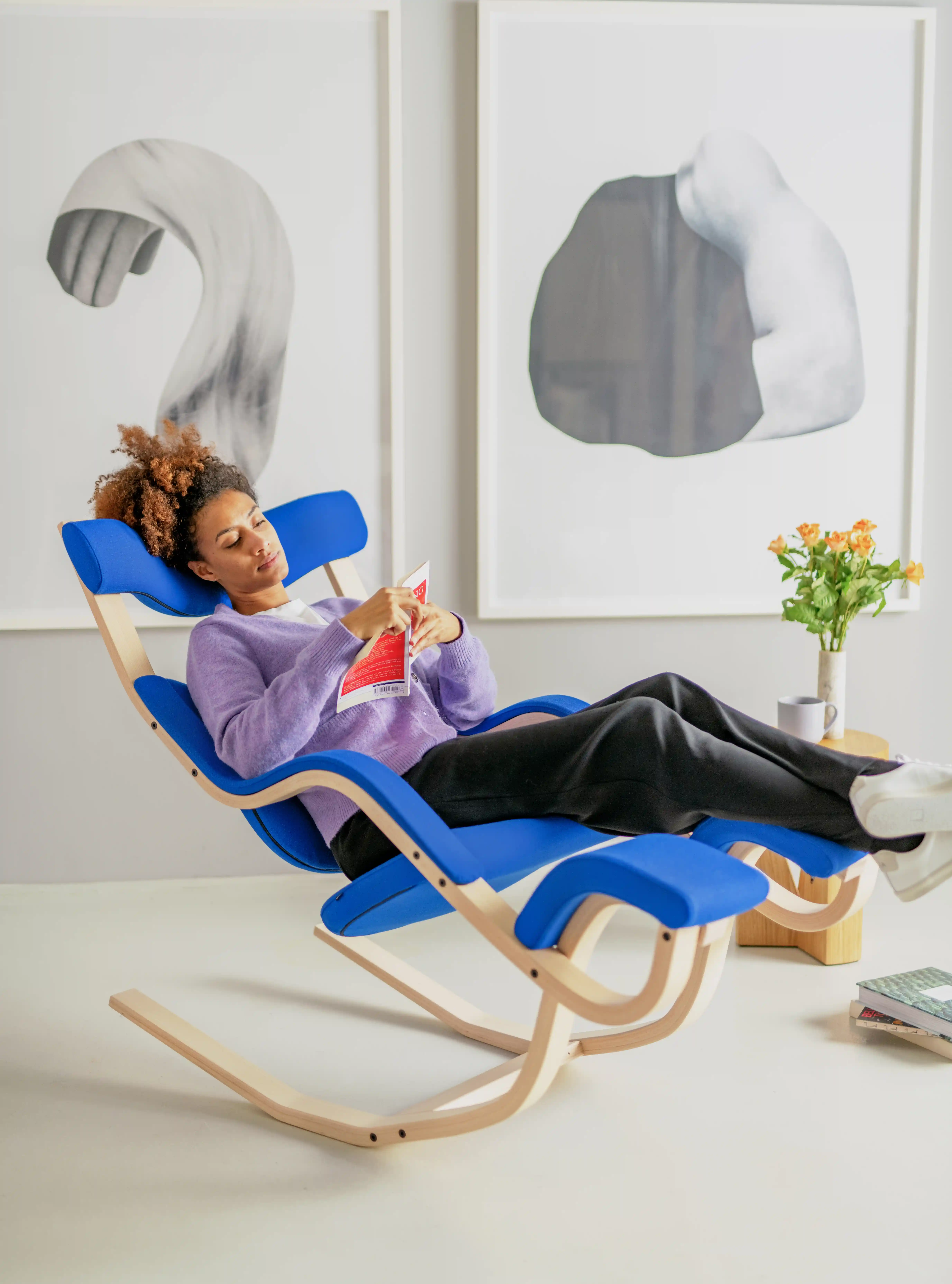 Gravity™ transforms how you sit no mechanisms, just you shifting weight across its curved wooden frame. Lean forward to kneel, slide back to sit upright, or push further to recline. At full recline, your legs lift above your heart and the chair gently rocks with your breathing an experience of dynamic rest that promotes circulation, focus, and physical ease.